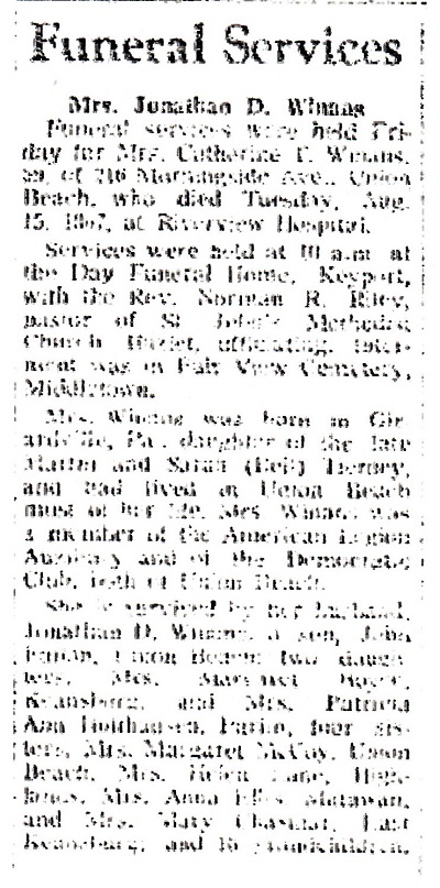 Lived at 216 Morningside Ave., Union Beach. Services held at Day Funeral Home in Keyport, Rev. Riley from St. John's Methodist Church in Hazlet officiating.