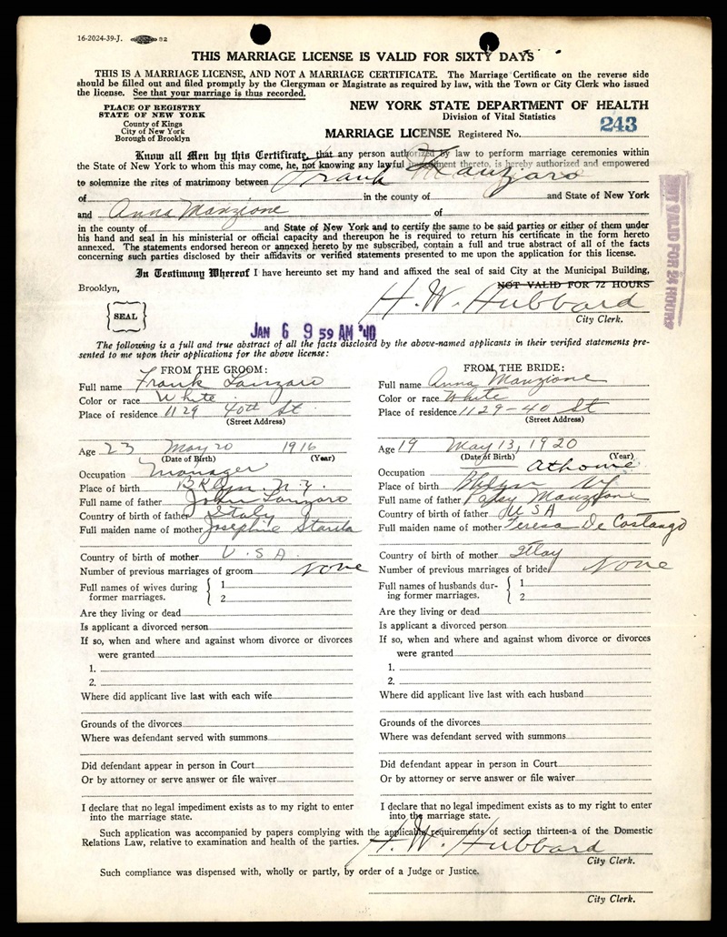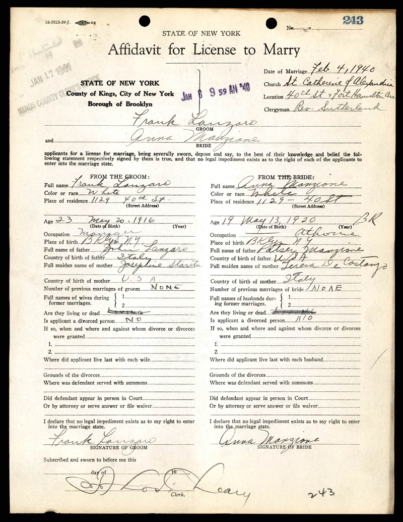 Frank Lanzaro and Anna Manzione Marriage Certificate