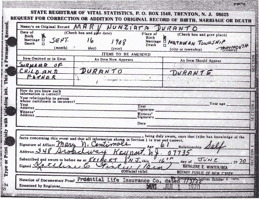 The original birth certificate misspelled Durante as Duranto. Here, Mary has requested a correction in 1970, two years before she died.