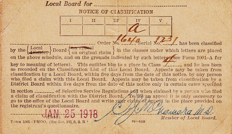 He was classified 4A. This was "Exempted due to extreme hardship." He and Eve had just married.