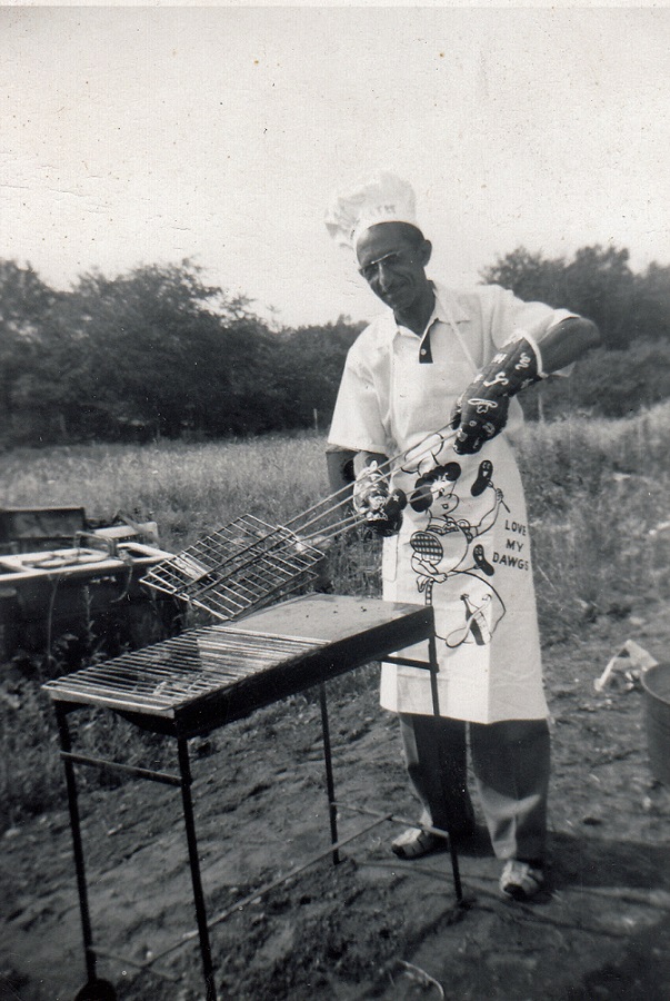Standing, from left to right: Aunt Evelyn (Winans) Lanzaro, Pete Peterson, Barbara Johnston, Uncle Joe Lanzaro (with chef's hat), Minnie (Cannizzaro) Johnston, Blick Wyckoff (drinking beer),